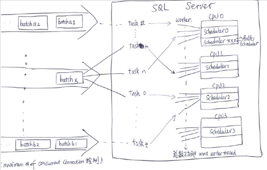 我們大概了解了一下SQL SERVER SQLOS的任務(wù)調(diào)度 我們回到我們的并行話題看一下這個(gè)并行執(zhí)行的調(diào)度情況: