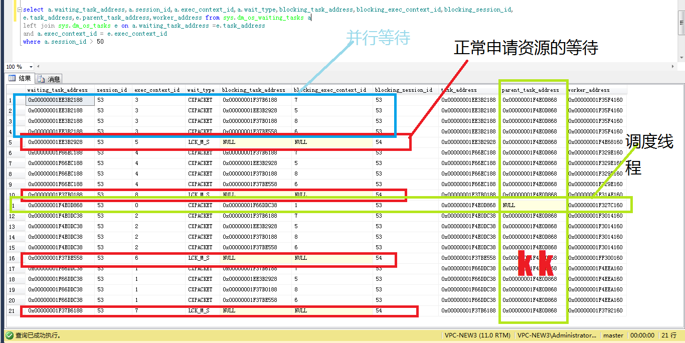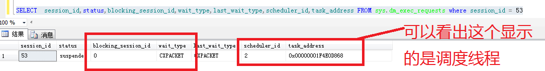 blocking_session_id 竟然是0 , wait_type 竟然是CXPACKET(并行等待,我們知道主要的等待原因不是這個),另外觀察 發(fā)現(xiàn)這里面抓取的TASK_ADDRESS 是調度線程。經(jīng)過其他實驗得知 sys.dm_exec_requests 在并行的等待中無法獲得真正的等待類型和資源。如果取消并行,執(zhí)行一個串行計劃兩個視圖得到的結果是一樣的。
