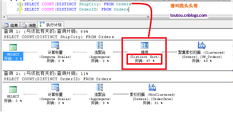 從上圖中可以看到,其實(shí)這兩個(gè)查詢從語(yǔ)句上來(lái)說(shuō)沒(méi)什么太大的區(qū)別,但是為什么開銷會(huì)不一樣,一個(gè)是查詢城市一個(gè)是查詢訂單號(hào)。這是因?yàn)槠鋵?shí)DISTINCT對(duì)于OrderID查詢來(lái)說(shuō),是沒(méi)有什么意義的,因?yàn)镺rderID是主鍵,是不會(huì)有重復(fù)的。而ShipCity是會(huì)有重復(fù)的,Sql server的去重機(jī)制在去重的時(shí)候,會(huì)有一個(gè)排序的過(guò)程。這個(gè)排序還是比較消耗資源的。
