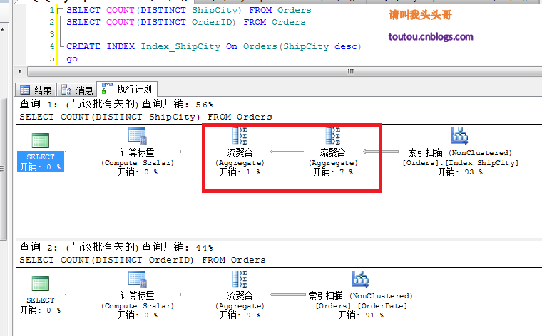 從上圖中可以看到,加了索引以后COUNT(DISTINCT ShipCity)的查詢變成了兩個(gè)流聚合,而沒(méi)有了排序,節(jié)省了開銷。