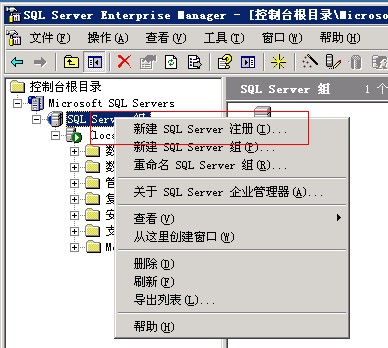 1)這種方法要求我們自己電腦上安裝了微軟的SQLServer軟件。打開開始菜單->程序->Microsoft SQL Server->企業(yè)管理器,依次展開Microsoft SQL Servers->SQL Server 組->(local),右鍵點(diǎn)擊SQL Server 組,再點(diǎn)擊新建SQL Server注冊(cè)。
