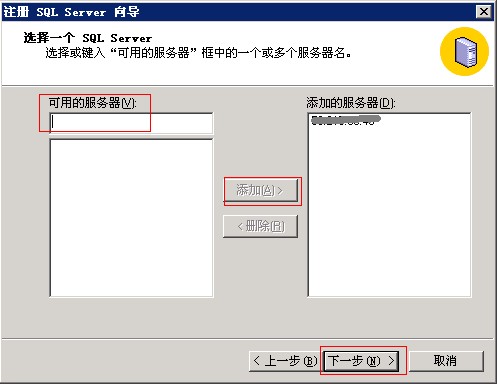 2)在注冊(cè)SQL Server向?qū)е?,點(diǎn)擊下一步。然后在可用的服務(wù)器下輸入數(shù)據(jù)庫IP地址,點(diǎn)擊添加,再點(diǎn)擊下一步。