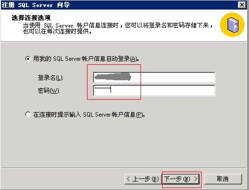 3)接下來選擇管理員給我分配的SQL Server登錄信息,再點(diǎn)擊下一步。然后輸入用戶名密碼,還是點(diǎn)擊下一步,最后點(diǎn)擊完成。