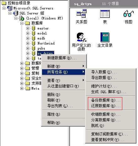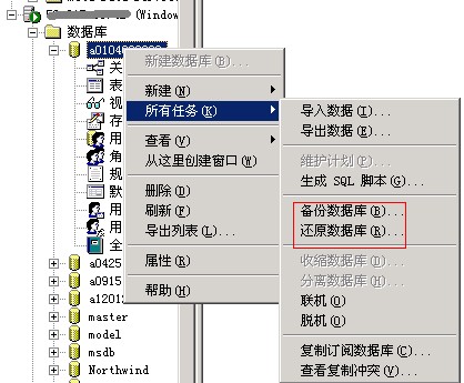 6)接下來,右鍵點(diǎn)擊數(shù)據(jù)庫名,選擇所有任務(wù),再點(diǎn)擊備份數(shù)據(jù)庫或還原數(shù)據(jù)庫。關(guān)于備份和還原的具體操作辦法,請(qǐng)看下面獨(dú)立服務(wù)器中的說明。