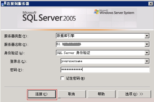 2)在服務(wù)器名稱上輸入IP地址,身份驗(yàn)證選擇SQL Server身份驗(yàn)證,然后輸入數(shù)據(jù)庫用戶名和密碼,點(diǎn)擊連接即可。后續(xù)步驟和SQLServer2000的類似。
