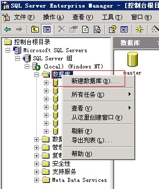 1)打開開始菜單->程序->Microsoft SQL Server->企業(yè)管理器,依次展開Microsoft SQL Servers->SQL Server 組->(local)->數(shù)據(jù)庫,右鍵點(diǎn)擊數(shù)據(jù)庫,再點(diǎn)擊新建數(shù)據(jù)庫。