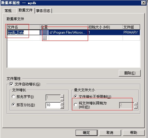2)數(shù)據(jù)庫屬性對(duì)話框中,在常規(guī)選項(xiàng)卡中輸入數(shù)據(jù)庫名,然后在數(shù)據(jù)文件和日志文件中指定名稱和保存位置(建議把數(shù)據(jù)庫放在D盤),還可以指定數(shù)據(jù)庫的最大限額。