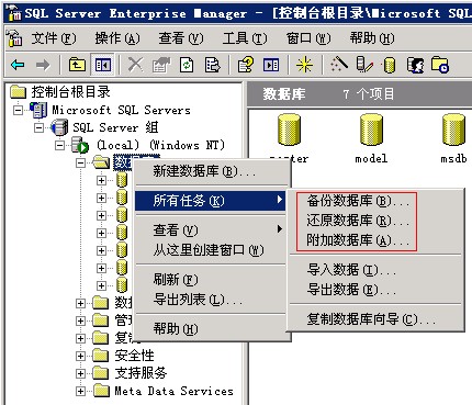 1)打開開始菜單->程序->Microsoft SQL Server->企業(yè)管理器,依次展開Microsoft SQL Servers->SQL Server 組->(local)->數(shù)據(jù)庫,右鍵點(diǎn)擊數(shù)據(jù)庫名,選擇所有任務(wù),再點(diǎn)擊附加數(shù)據(jù)庫。
