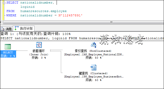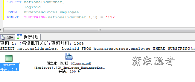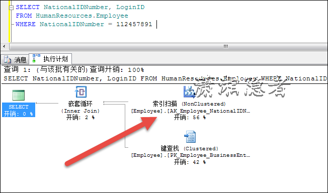 如下示例,AdventureWorks2014數(shù)據(jù)庫的HumanResources.Employee表,由于NationalIDNumber字段類型為NVARCHAR,下面SQL發(fā)生了隱式轉(zhuǎn)換,導致其走索引掃描(Index Scan)