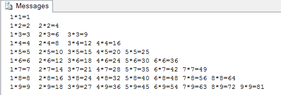 DECLARE @I INT ,@J INT,@S VARCHAR(100) SET @I=1 WHILE @I<10 BEGIN SET @J=@I SET @S='' WHILE @J<10 BEGIN SET @S=@S+CAST(@I AS CHAR(1))+'*'+CAST(@J AS CHAR(1))+'='+CAST((@I*@J)AS CHAR(3)) SET @J=@J+1 END PRINT @S SET @I=@I+1 END