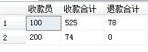 with ta as (select '收' as 標記,'100' as 收款員,150 as 金額 union select '收','100',375 union select '退','100',78 union select '收','200',74 ) select 收款員,sum(case when 標記='收' then 金額 else 0 end) as 收款合計, sum(case when 標記='退' then 金額 else 0 end) as 退款合計 from ta group by 收款員
