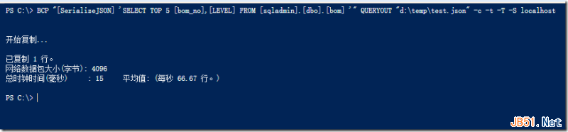 如果希望將SQL Server中數(shù)據(jù)導(dǎo)出為Json,雖然這種操作在應(yīng)用程序里已經(jīng)有非常成熟的方法,但SQL Server其實并沒有原生支持這種方式(小道消息,下個版本會支持)。我推薦使用這篇帖子的方式:https://www.jb51.net/article/61462.htm來做。將該帖子所提供的存儲過程建立完成后,使用如下BCP命令: