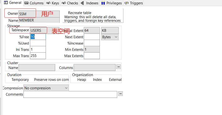 如下圖,PL/SQL中表的信息頁所示,MEMBER表屬于SSM用戶,存儲在USERS表空間。