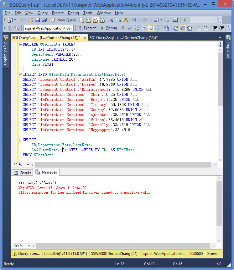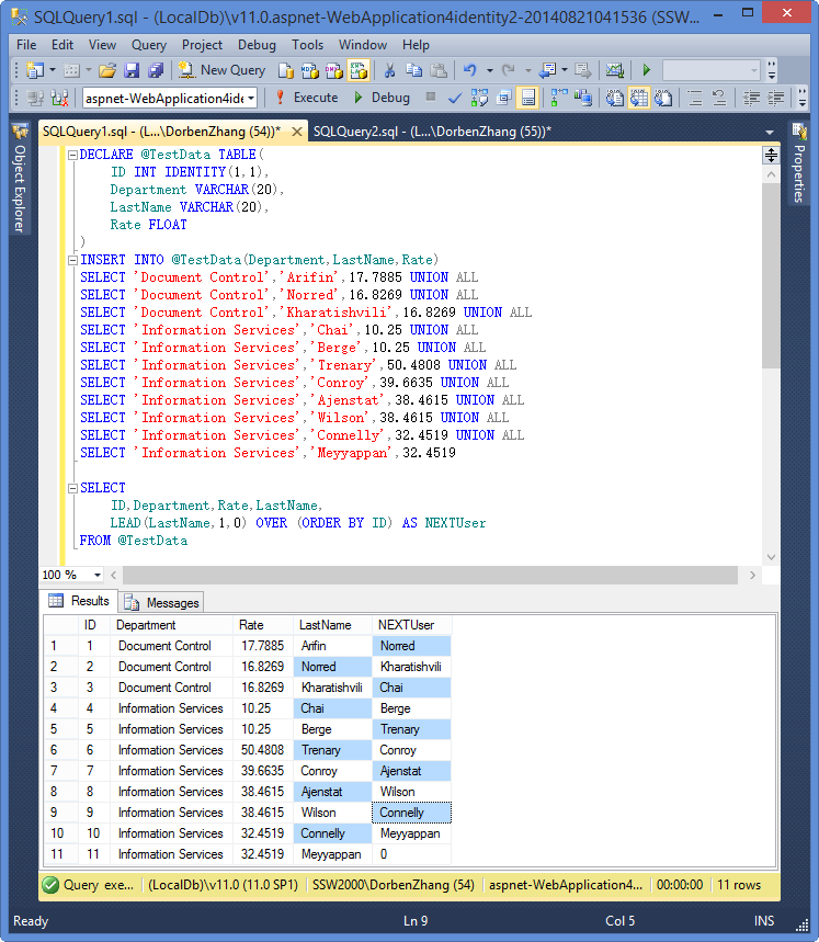 DECLARE @TestData TABLE( ID INT IDENTITY(1,1), Department VARCHAR(20), LastName VARCHAR(20), Rate FLOAT ) INSERT INTO @TestData(Department,LastName,Rate) SELECT 'Document Control','Arifin',17.7885 UNION ALL SELECT 'Document Control','Norred',16.8269 UNION ALL SELECT 'Document Control','Kharatishvili',16.8269 UNION ALL SELECT 'Information Services','Chai',10.25 UNION ALL SELECT 'Information Services','Berge',10.25 UNION ALL SELECT 'Information Services','Trenary',50.4808 UNION ALL SELECT 'Information Services','Conroy',39.6635 UNION ALL SELECT 'Information Services','Ajenstat',38.4615 UNION ALL SELECT 'Information Services','Wilson',38.4615 UNION ALL SELECT 'Information Services','Connelly',32.4519 UNION ALL SELECT 'Information Services','Meyyappan',32.4519 SELECT * FROM @TestData