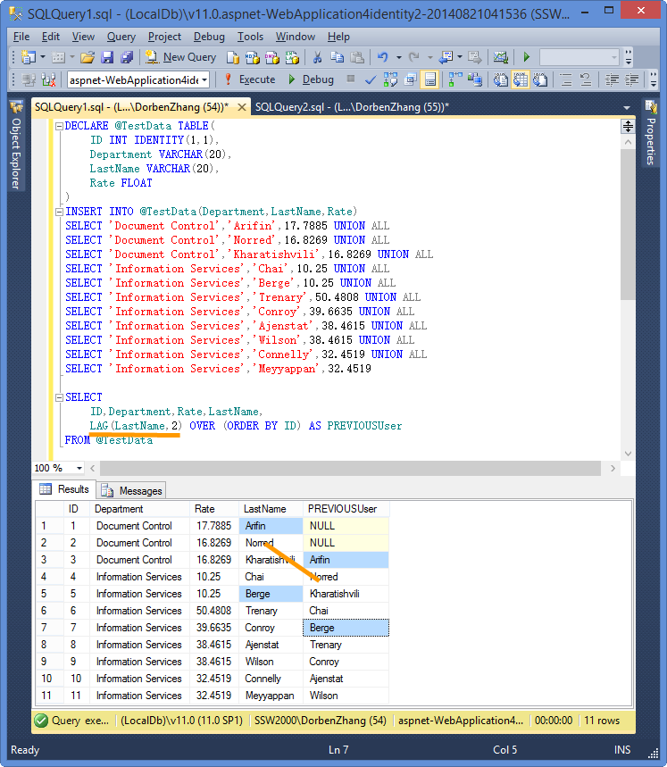 可以看到,LEAD函數(shù)把ID為2的那一行的LastName值提取到第一行顯示為新列NEXTUser,就這么個(gè)功能