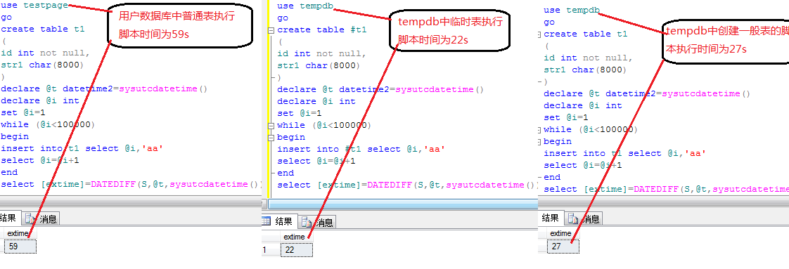 我們分別在用戶數(shù)據(jù)庫(testpage),tempdb中創(chuàng)建相似對(duì)象t1,#t1,并在tempdb中創(chuàng)建創(chuàng)建非臨時(shí)表,然后執(zhí)行相應(yīng)的insert腳本(用以產(chǎn)生日志),并記錄執(zhí)行時(shí)間用以比較用以比較說明tempdb”快”
