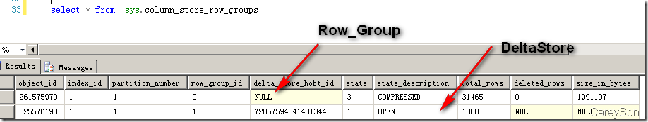 上述列存儲的兩部分我們可以通過2014新引入的DMV進(jìn)行觀測,如圖3所示。在圖3中,我們隊(duì)目前已經(jīng)存在31465行的聚集列索引插入了1000行新的數(shù)據(jù),則SQL Server認(rèn)為這部分?jǐn)?shù)據(jù)不滿10W行,因此以Deltastore的方式存在。