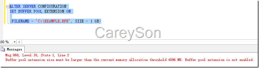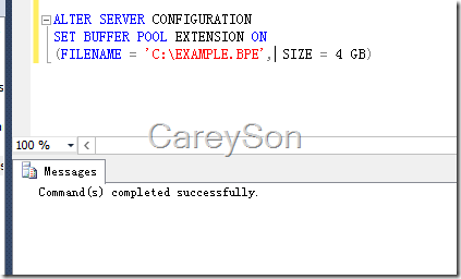 在SQL Server 2014總,啟用Buffer Pool Extension非常簡(jiǎn)單,僅僅需要擁有SysAdmin權(quán)限后,輸入一個(gè)T-SQL語(yǔ)句即可,如圖3所示。