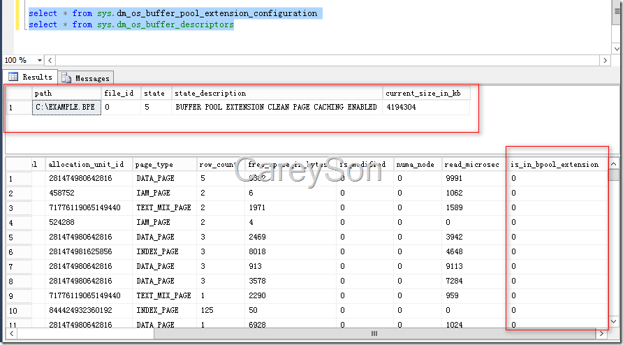 對(duì)于該功能,SQL Server引入了一個(gè)全新的DMV和在原有的DMV上加了一列,來(lái)描述Buffer Pool Extention,如圖6所示。