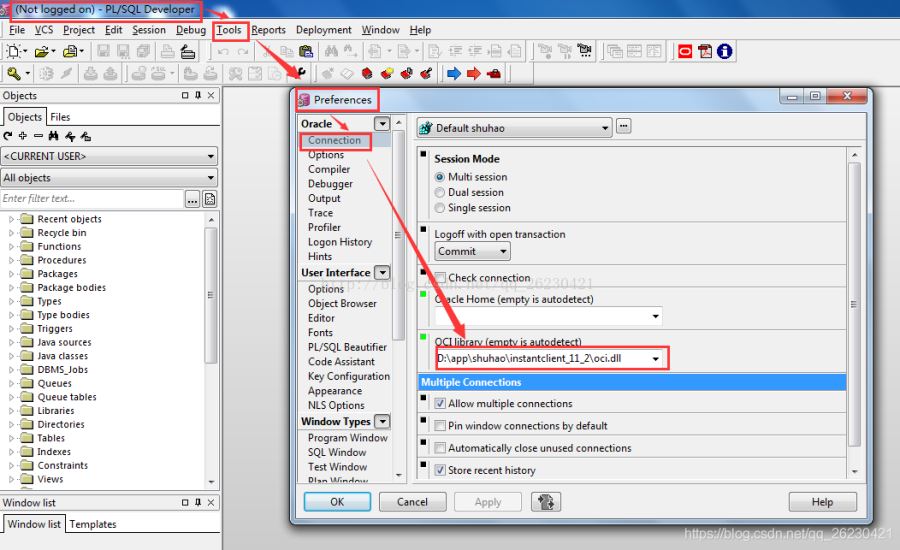 不登錄plsql,直接按Cancel,進(jìn)入后在Tools--->Preferences---->Connection中配置OCI為32位客戶端的OCI