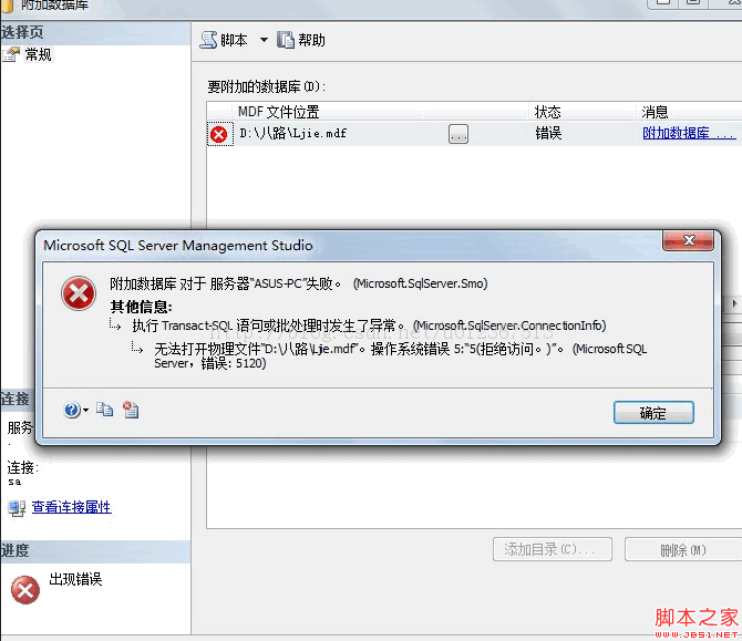 SQLServer錯(cuò)誤5120:先用widows用戶登錄附加再分離重新用sa附加就行了