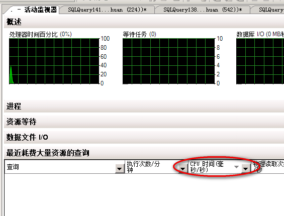 2、從最容易入手的低效SQL開始,考慮是不是最近業(yè)務(wù)做了什么修改?連接到該SQL實例,打開活動監(jiān)視器,展開“最近耗費大量資源的查詢”,并CPU時間倒序,在這里并未發(fā)現(xiàn)有即時的耗費資源的查詢。據(jù)個人經(jīng)驗,這里的值如果是4位數(shù),分鐘內(nèi)執(zhí)行次數(shù)3位數(shù),一般的服務(wù)器CPU大概就10%以上,如果cpu時間那里是5位數(shù),且分鐘內(nèi)執(zhí)行次數(shù)也很高,幾百次以上,那CPU一般就會不淡定了。圖片僅為演示