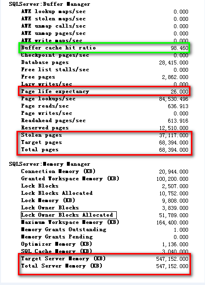3、沒有耗資源的SQL,這是DBA最不愿意看到的結(jié)果,因為也許,SQL Server受到了來自內(nèi)部或者外部的壓力,使得自己花費了過多的時間去處理與操作系統(tǒng)的溝通去了。SQL Server常見的非查詢低效類的性能問題,絕大多數(shù)都來自于內(nèi)存或者硬盤,而這兩者有的時候需要同時研究對比基線,才能確定誰是因,誰是果。在這里,我們首先查看SQL Server內(nèi)存使用情況,當(dāng)打開性能計數(shù)器時,我和我的小伙伴們都驚呆了……安裝了64G內(nèi)存的數(shù)據(jù)庫,SQL Server的TargetMemory僅有500多兆!這其中StolenPage還占用了200多兆,數(shù)據(jù)庫DataPage僅有200多兆的內(nèi)存可供使用,Oh,Shit!雖然我很不想用“去哪了”這三個字,但是“我的內(nèi)存去哪了“?同時我們也注意到PageLifeExpectancy值只有26(一個內(nèi)存充足的服務(wù)器,這個值至少應(yīng)該是上W的),而很早之前我們津津樂道的"Cache Hit Ration"卻仍然保持一個比較高的水準(zhǔn)98! 這個案例告訴我們,緩存命中率這個性能計數(shù)器很多時候說明不了什么問題。