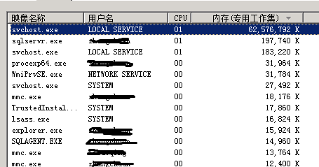4、OK,既然這樣,是誰占用了本該屬于我親愛的SQL Server的內(nèi)存呢?我們繼續(xù),打開Wiindows任務(wù)管理,選定進(jìn)程選項卡,點擊顯示所有用戶進(jìn)程,發(fā)現(xiàn)svchost.exe占用了絕大多數(shù)的60G內(nèi)存!