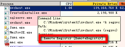 5、那svchost.exe又是個什么東西呢?我們下面就用到ProcessMonitor這個工具了,打開后自動加載所有Wiindows進(jìn)程,按內(nèi)存排序后,鼠標(biāo)移至svchost.exe進(jìn)程上,顯示為Remote Registry服務(wù)。