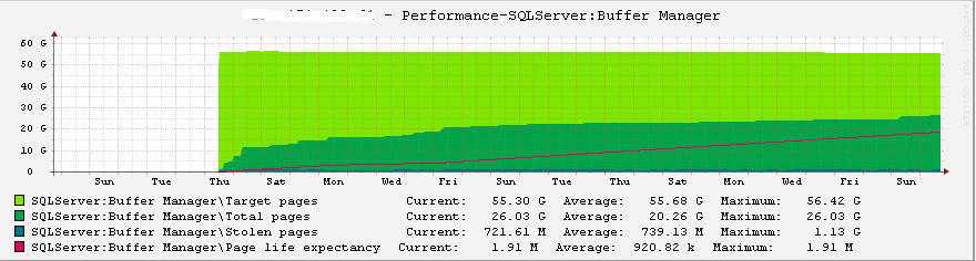 附一張內(nèi)存監(jiān)控圖,可以看到服務(wù)重啟之后,SQL Server的Total Pages一直在上升,并逐漸穩(wěn)定,Page life expectancy也在變得越來越大,CPU也能指示病癥已消除,我很欣慰。