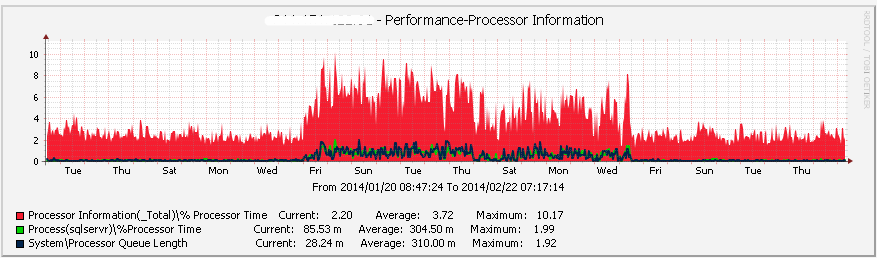 1、首先打開Cacti監(jiān)控,發(fā)現(xiàn)最近CPU均值在某天之后驟然上升,并且可以看到System\Processor Queue Length和sqlservr\%ProcessorTime 也在顯著的變化。