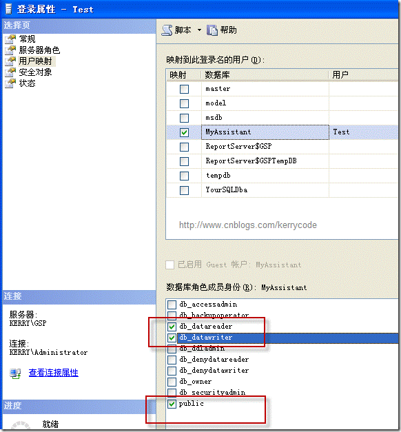3:在用戶映射選項當中,選擇"db_datareader"、"db_datawriter"、"public"三個數(shù)據(jù)庫角色成員。