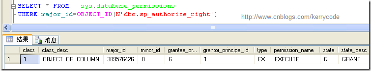 此時,已經(jīng)實現(xiàn)了擁有DML操作權(quán)限,如果需要擁有存儲過程和函數(shù)的執(zhí)行權(quán)限,必須使用GRANT語句去授權(quán),一個生產(chǎn)庫的存儲過程和函數(shù)加起來成千上百,如果手工執(zhí)行的話,那將是一個辛苦的體力活,而我手頭有十幾個庫,所以必須用腳本去實現(xiàn)授權(quán)過程。下面是我寫的一個存儲過程,亮點主要在于會判斷存儲過程、函數(shù)是否已經(jīng)授予了EXE或SELECT權(quán)限給某個用戶。這里主要用到了安全目錄試圖sys.database_permissions,例如,數(shù)據(jù)庫里面有個存儲過程dbo.sp_authorize_right,如果這個存儲過程授權(quán)給Test用戶了話,那么在目錄試圖sys.database_permissions里面會有一條記錄,如下所示: