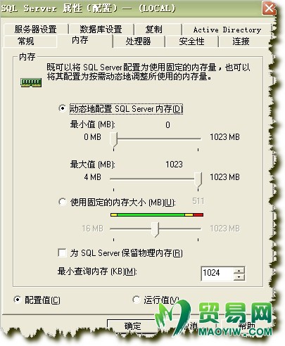 在這里,你會(huì)看到MSSQL默認(rèn)設(shè)置為使用最大內(nèi)存,也就是你所有的內(nèi)存,根據(jù)你的需要,設(shè)置它的最大值吧.