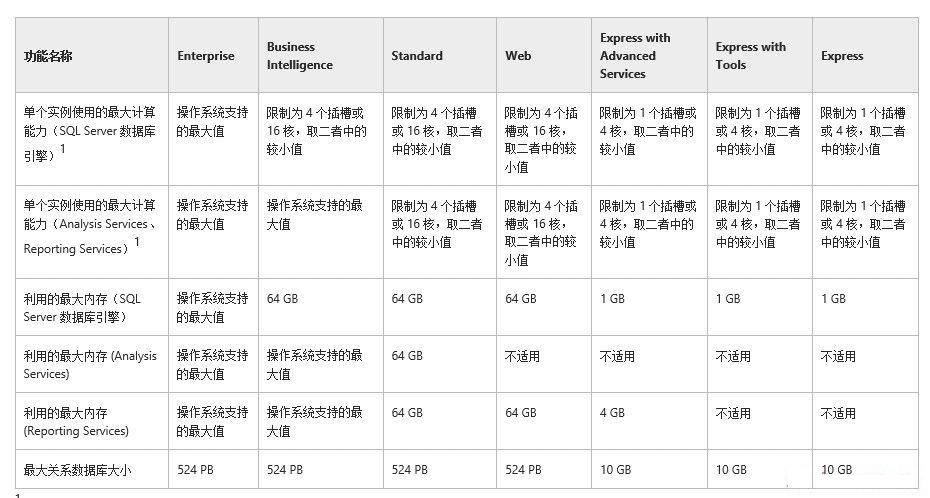 有關(guān) SQL Server Evaluation 版和 SQL Server Developer 版支持的功能,請參閱 SQL Server Enterprise 功能集。 若要導航到 SQL Server 技術(shù)的對應表,請單擊其鏈接: 轉(zhuǎn)換箱規(guī)模限制