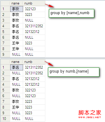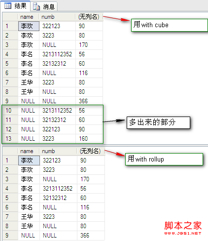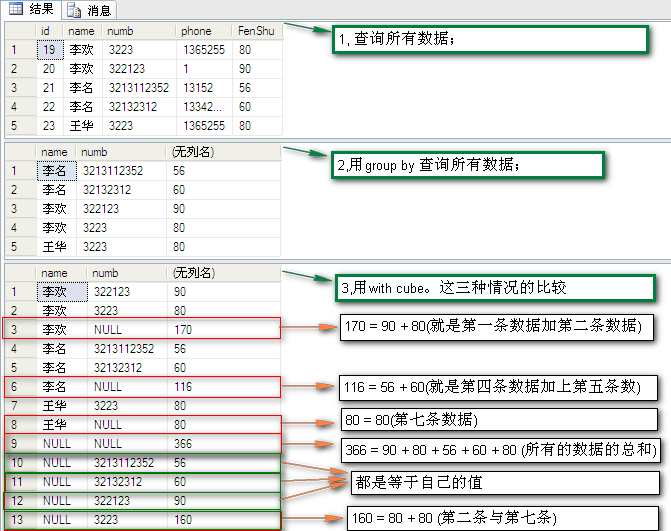 select [name],numb,sum(fenshu) from dbo.PeopleInfo group by [name],numb with cube --3,用with cube。這三種情況的比較
