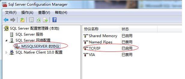 2、點(diǎn)擊MSSQLSERVER的協(xié)議,在右側(cè)的頁(yè)面中選擇TCP/IP協(xié)議