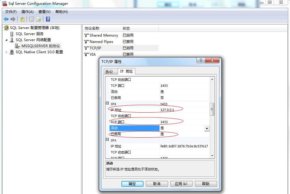 4、跳出來(lái)的對(duì)話框,里面有好多TCP/IP的端口,找到“IP3”,更改IP地址 為自己電腦的IP地址(或者是127.0.0.1) 在TCP端口添加1433,然后選擇啟動(dòng)
