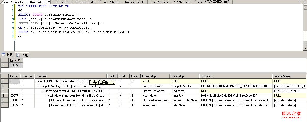 SQL預估這個join能返回50313行,實際返回50577行。因為SQL在兩張表的[SalesOrderID]上都有統(tǒng)計信息,所以這里的預估非常準確