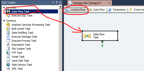 創(chuàng)建好工程后,在Control Flow這個Tab下拖入一個Data Flow Task,如下圖: