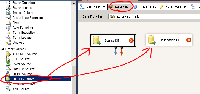 然后我們在左邊工具欄里找到OLE DB Source,繼續(xù)拖兩個OLE DB Source出來。分別給它們命名為Source DB和Destination DB。