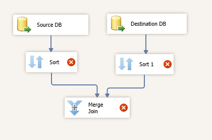 再來就是拖兩個Sort及一個Merge Join出來,將之前的數(shù)據(jù)源箭頭分別指向兩個Sort,最后兩個Sort出來的數(shù)據(jù)同時輸入Merge Join中。
