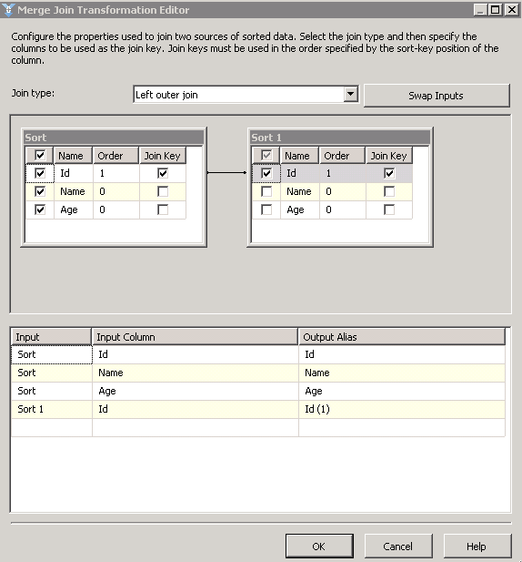 分別雙擊兩個Sort,鉤選表中的ID,對ID這個字段進(jìn)行一次排序。因?yàn)镸erge Join這個流程要求輸入的數(shù)據(jù)是已排序好的。這個排序也可以直接在數(shù)據(jù)源中對它們的輸出字段設(shè)置SortKeyPosition這個屬性來排序。(詳見:http://msdn.microsoft.com/zh-cn/library/ms137653.aspx)