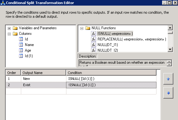 現(xiàn)在我們需要一個分支,即新的數(shù)據(jù)需要插入備份數(shù)據(jù)庫中,而已有的數(shù)據(jù)需要更新為新的值。我們從工具欄中拖入一個Conditional Split來進(jìn)行這樣的分支處理。我們將Merge Sort中的輸出指向Conditional Split,然后雙擊Conditional Split,如下圖所示設(shè)置(注意條件一個是ISNULL,一個是非ISNULL)。