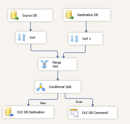 這時它們的輸入值就被分成兩種條件輸出,最后我們再拖入一個OLE DB Destination來插入數(shù)據(jù)和一個OLE DB Command來更新數(shù)據(jù)庫,最終流程如下圖: