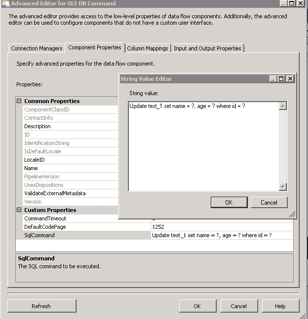 雙擊設(shè)置OLE DB Command,首先在Connection Managers這個Tab中選擇好鏈接對象,然后在Component Properties這個選項(xiàng)卡中,設(shè)置你的SqlCommand屬性。如下圖: