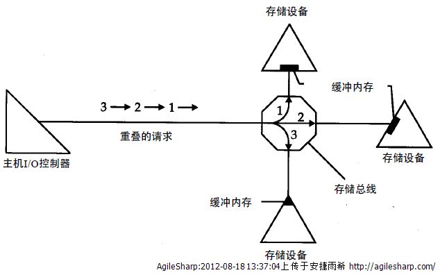 在協(xié)調(diào)性能有差異的控制器和設(shè)備工作方面,緩沖常常能夠發(fā)揮作用,這種方式的緩沖可以看作是某種轉(zhuǎn)換器。主機(jī)I / O控制器上的芯片可以快速地通過I / O路徑傳輸數(shù)據(jù),它們的性能可以達(dá)到納秒級,而對于磁盤和磁帶驅(qū)動器這樣一類的機(jī)電存儲設(shè)備,其數(shù)據(jù)的傳輸速度只能在微秒范圍內(nèi)。因此,設(shè)備制造商把緩沖內(nèi)存放入設(shè)備中,以減少訪問延遲,以適合主機(jī)控制器的性能。這樣,主機(jī)控制器可以同時地在多個設(shè)備上實(shí)施重疊操作,圖顯示了這種重疊過程。