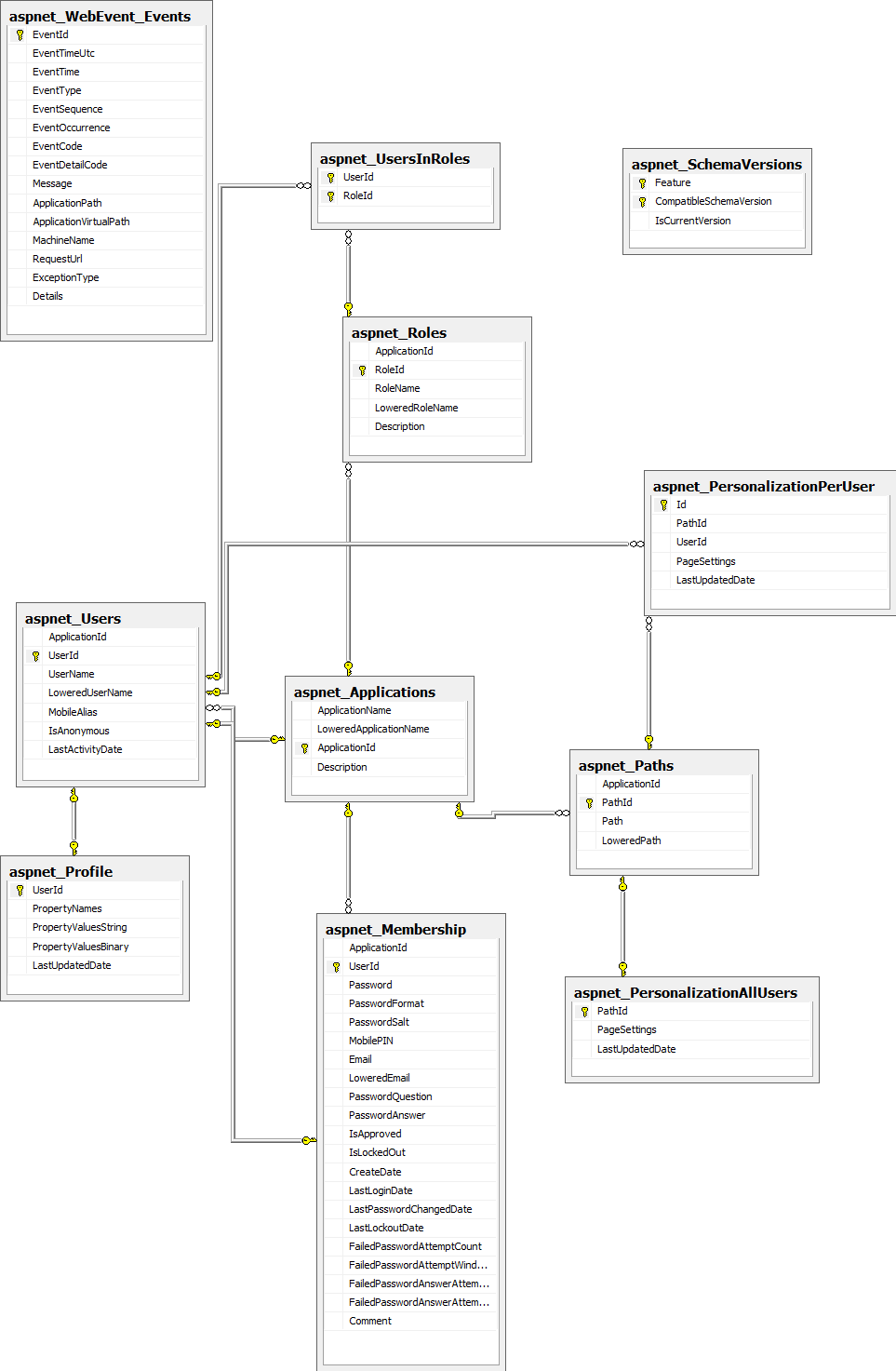 整個(gè)MSPetShop4Services數(shù)據(jù)庫(kù)的關(guān)系圖。整個(gè)這幅圖,是不是看著一張一張的表格了解表之間的關(guān)系舒服多了,當(dāng)然我們還是要看懂整個(gè)表的意思,首先最上面的是表名,下面的都是字段,有些字段左邊有個(gè)鑰匙,那是主鍵的意思。在表之間有個(gè)線連著就說(shuō)明這兩個(gè)表之間存在主鍵和外鍵的關(guān)系,其中一半都有鑰匙的指的是主鍵,一個(gè)無(wú)窮大的符號(hào)表示的外鍵。但是不知道細(xì)心的朋友有沒(méi)有發(fā)現(xiàn)一個(gè)問(wèn)題,比如說(shuō)aspnet_Paths和aspnet_PersonalizationAllUsers表之間的線的兩端都是鑰匙的,我也找了很久資料沒(méi)有找到,于是自己寫代碼測(cè)試了,到底是什么意思。