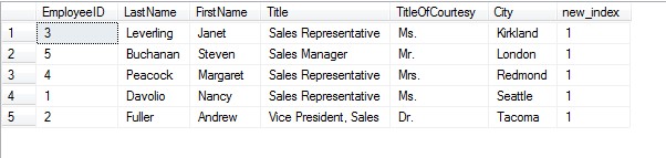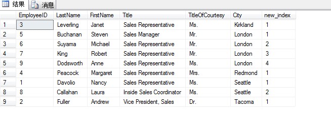 select EmployeeID,LastName,FirstName,Title,TitleOfCourtesy,City,ROW_NUMBER() over(partition by City order by EmployeeID) as new_index