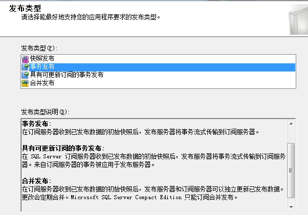 數(shù)據(jù)庫發(fā)布類型有三種:快照發(fā)布,事務(wù)性發(fā)布,具有可更新訂閱和事務(wù)性發(fā)布,合并發(fā)布